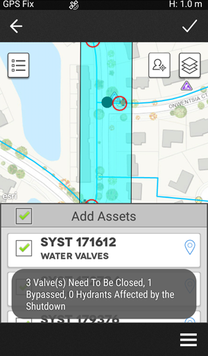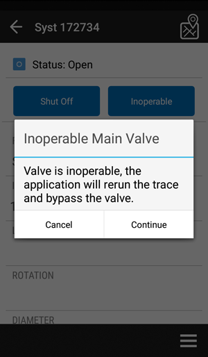 Valves that are inoperable or could not be found can be skipped, and the trace will rerun passing the valves. The asset locate tool can also be used to locate hard to find valves during an emergency shutoff.