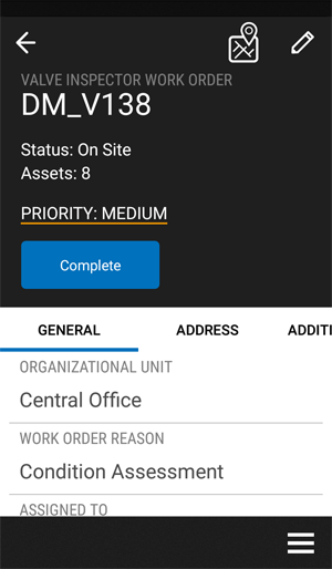 Once all the assets are inspected in the work order (which means that all the assets in the Asset list are either completed or skipped), you can complete the work order.