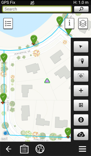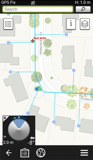| Selecting this button turns on the compass, which appears on the bottom left corner of the map. This tool helps guide the field crew to the precise location of the asset they are trying to find. It’s useful for locating assets that have been hidden from immediate view, for example, a valve cover that has been asphalted over.