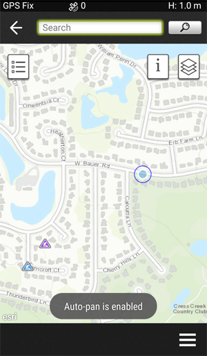 Tap this button to toggle auto map panning on and off. A brief message appears to show you what mode you are in. Autopanning is useful when you are moving to a new location. The map will move as you go to the new location. |