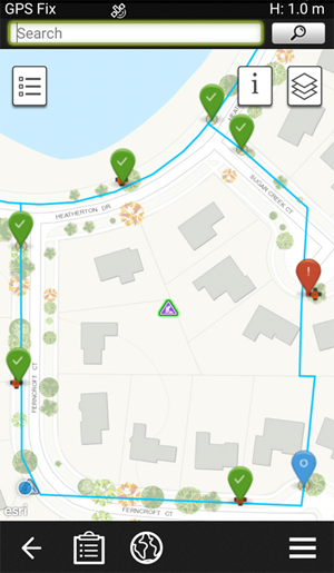 The map allows you to select and view assets, navigate to a work location, view your own current location, and capture or update an asset or work location.