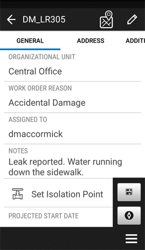 | Selecting this option triggers Map Navigation to find a route between your current location (as determined by GPS) and the location of the work order or asset. |