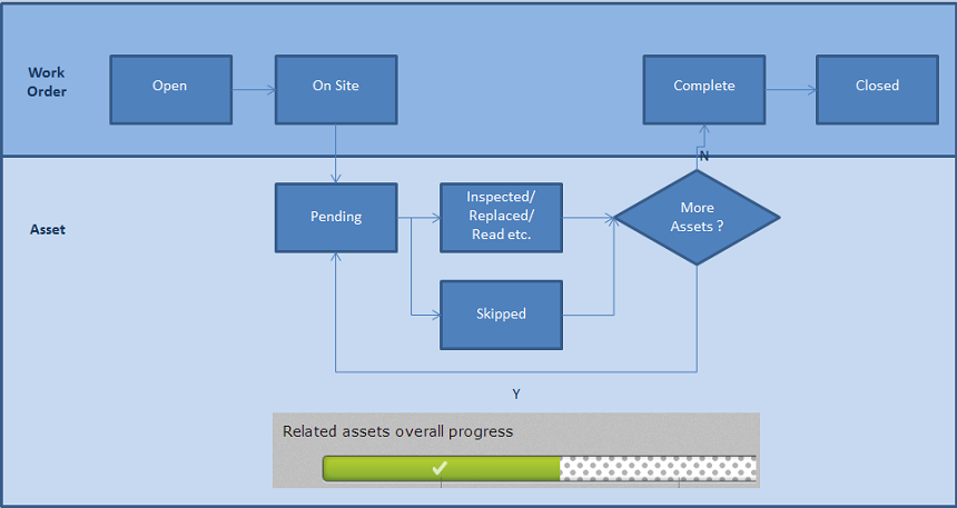 In fact, the current status of a work order is represented by a combination of the work order status, and the percentage of the assets associated with that work order for which the required operation has been completed.