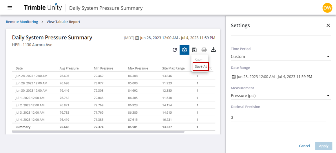 The Settings panel opens. From here you can customize things such as the date, measurement, or decimal precision depending on the report you chose.