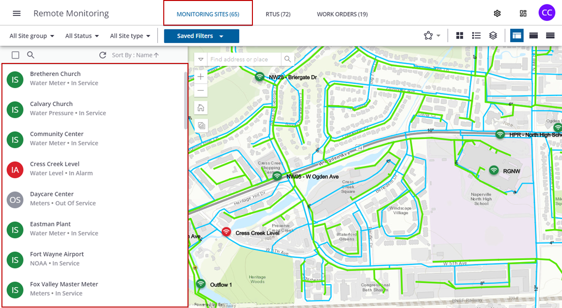 Monitoring sites are shown in the site list on the left and on the map. Blue monitoring site icons indicate that the monitoring site is in service, gray icons indicate that the site is out of service, and red icons indicate that the monitoring site has an active alarm.