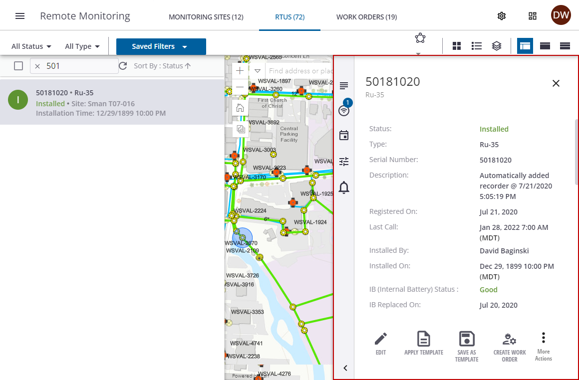 - Create Work Order: Create an RTU installation work order for this RTU.