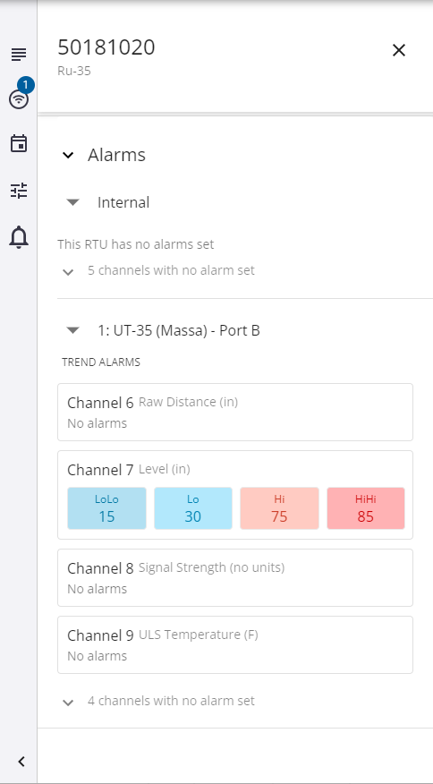 - Edit: Edit the battery status, communications, channels and sensors, and alarm configuration for the RTU.