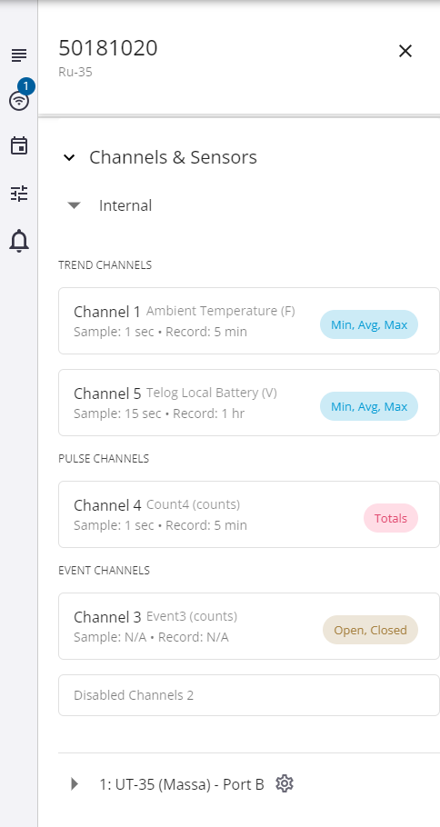 The Channels and Sensors section shows the channel configurations for this RTU. See Configure the RTU for more information.