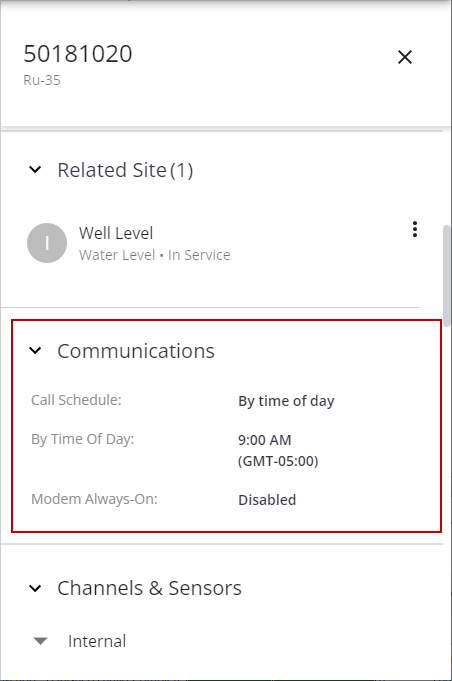 The Communications section shows the call schedule configured for this RTU. See Configure the RTU for more information.