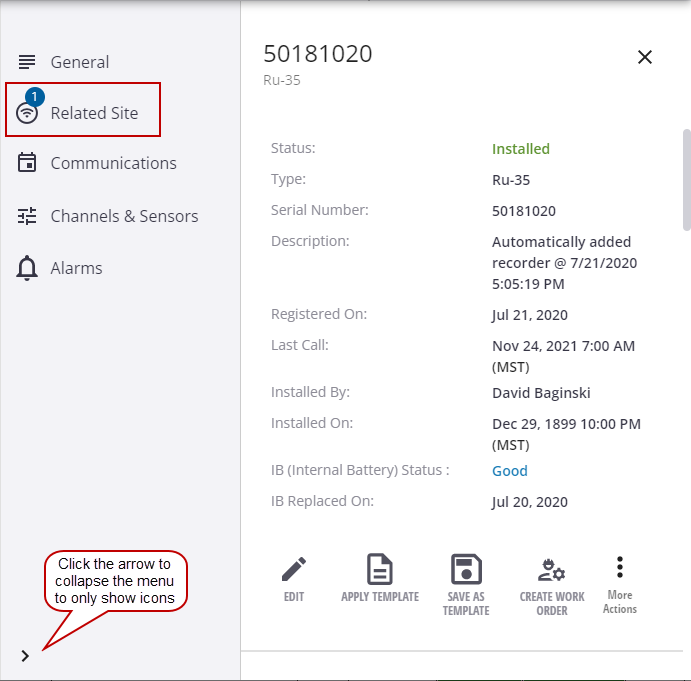 The Related Sites section shows the monitoring site where this RTU is installed.