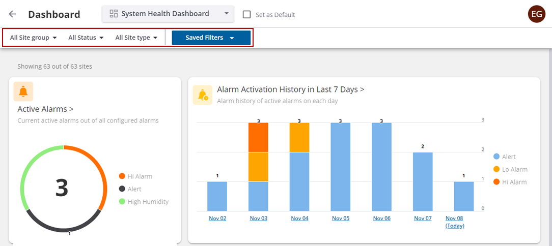 - Active Alarms: View active alarms by type. See View and Filter Alarms for a Site for more information.