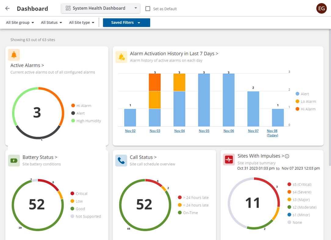 The System Health Dashboard allows you to monitor the health of your system with real-time insight into the availability and performance of the remote monitoring network and assets.