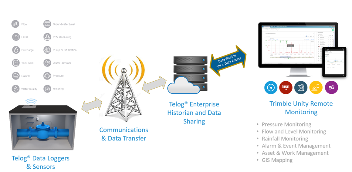 - Communication infrastructure. The overall remote monitoring solution relies on communication infrastructure to get the data from the field back to the center (by center we are talking about a centralized software and database hosted either on the cloud or in some circumstances at a client site). Depending on the location of the RTU (its site) and the capability of the RTU there may be a variety of options for communication of the data. Most frequently the solution will exploit 4G LTE cellular networks to send the data back via an onboard modem. However in some cases where a monitoring site has access to a utilities fixed network (for example, ethernet at a pumping station), it makes sense to use the fixed network as the communication method when the RTU supports this method of communication.