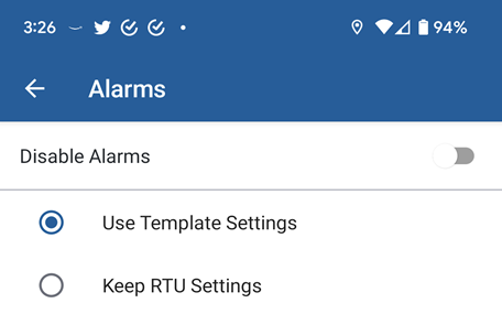 - Select Disable Alarms. This will automatically apply the template, but it will ignore both the template and RTU settings pertaining to alarms, disabling all RTU alarms.