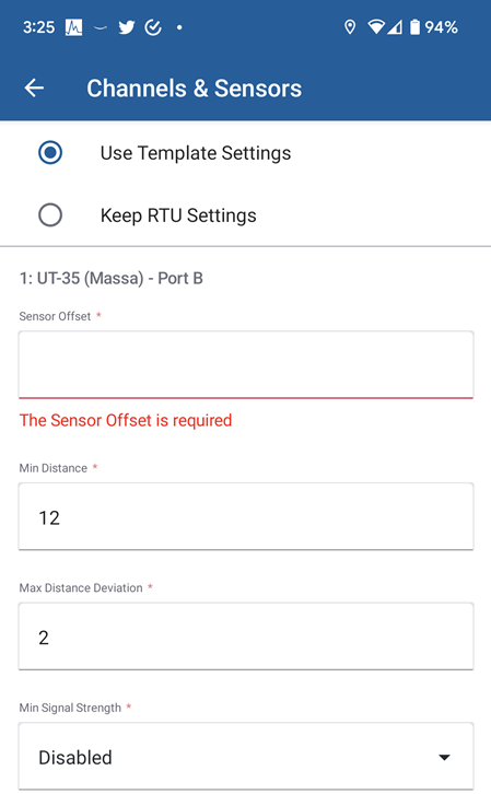 - Enter the Sensor Offest (if it has not automatically populated with the current setting in the RTU). This is different for every site and is a required field. This setting is the offset between the sensor and the bottom of a tank or pipe that is being monitored.