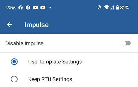 - Select Disable Impulse. This will automatically apply the template, but it will ignore both the template and RTU settings pertaining to impulses, disabling RTU impluse capture.