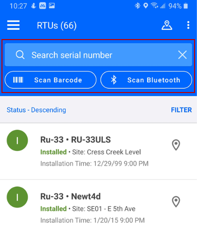 - Tap the RTU you want to tamper from the RTU list, or tap in the search field to search the RTU serial number, scan the RTU barcode, or scan for the RTU using Bluetooth.