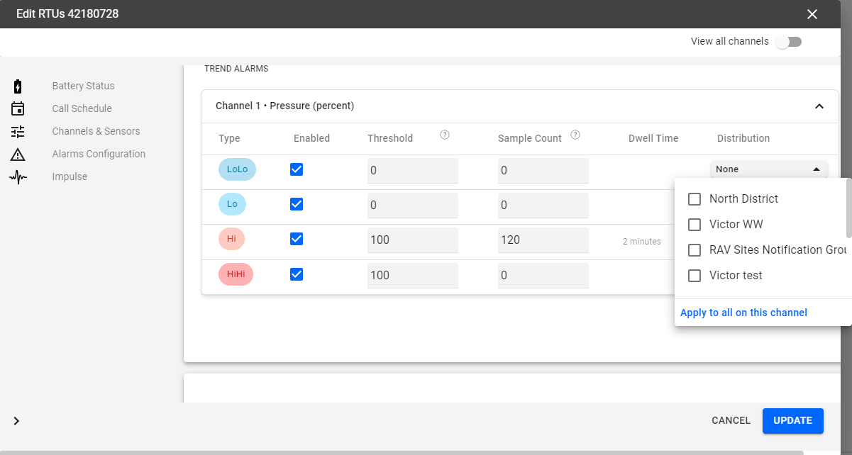 - Click the Distribution drop-down list to select groups of users to receive the alarm notifications.