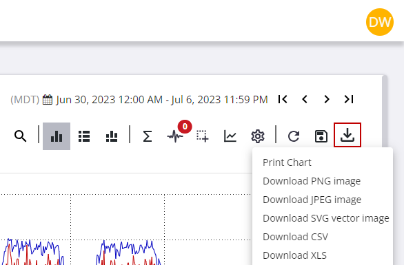- To export the data, click Download CSV or Download XLS. This will export the data points for all measurements displayed on the graph within the selected reporting period, including minimum and maximum data points, if enabled, and high resolution pressure impulse data when available.