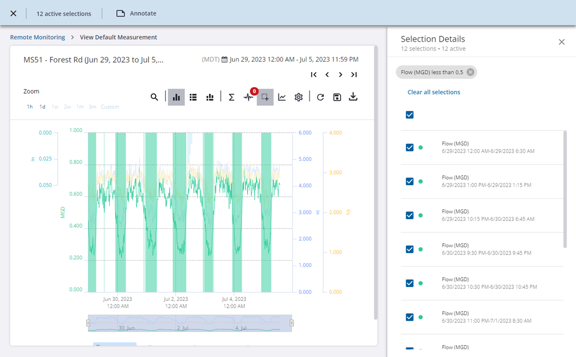 Users can create selections based on specific search criteria. Two types of selection criteria are supported: Missing Data and Value. Using Missing Data will create selections on the graph during periods of time where missing data is identified. Using Value will create selections that are greater than, equal to, or less than the value a user enters.