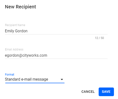 - For a new recipient, fill out the Recipient Name, Email Address, and Format for the notification, then click Save.