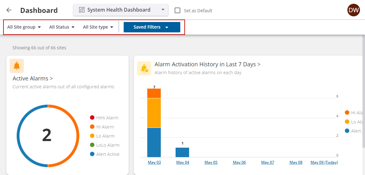 - You can filter the data in the dashboard based on the site group, status, and site type.