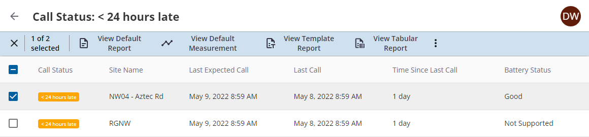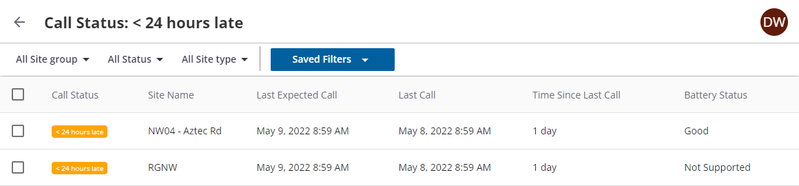 The list of calls shows the call status, site name, last expected call, last call, time since last call, and the battery status.