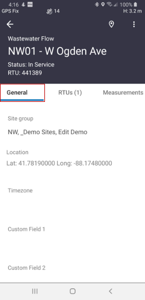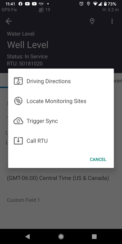 - Tap the more icon to access the Driving Directions, Locate Monitoring Sites, Trigger Sync, and Call RTU options. See Configure the RTU for more information on the Call RTU option.