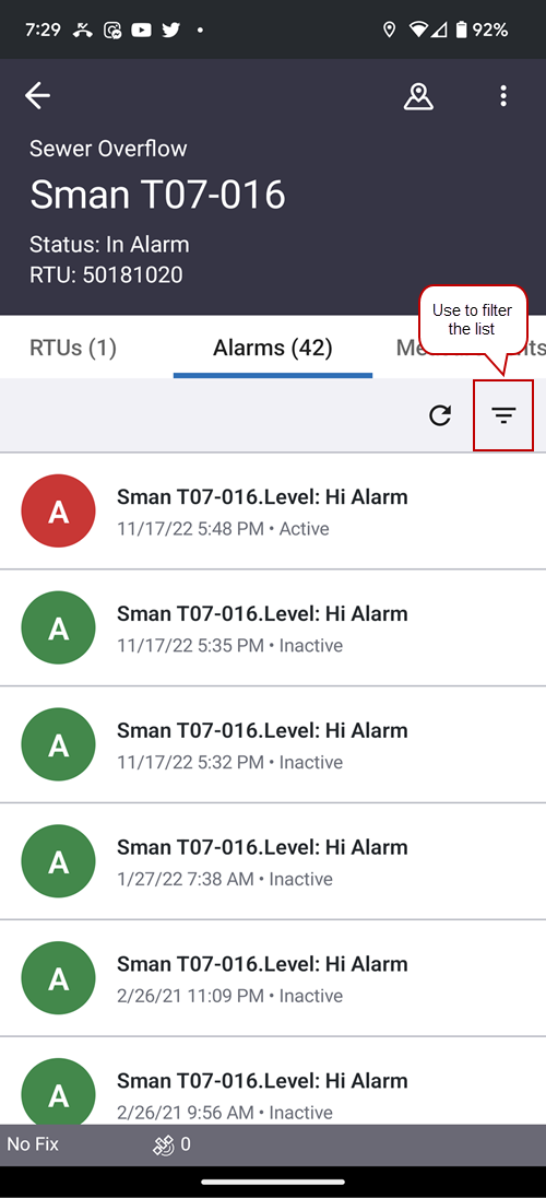 - Tap the Alarms tab to view the last 30 days of alarms. If the alarm is still active, they will appear in red. If they are not, they will appear in green. Use the filter icon to filter by the type of alarm, status of the alarm, or the measurement the alarm applies to.