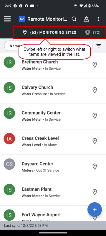 The list of monitoring sites in your organization displays first. You can switch between viewing monitoring sites, RTUs, etc. by swiping left or right and tapping the desired option.