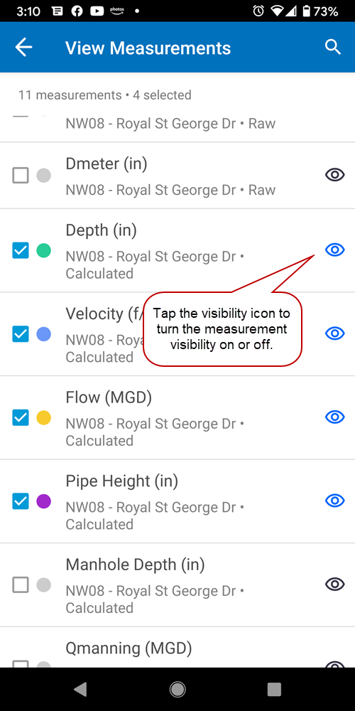 - Tap the visibility icon to turn the measurement visibility on or off.