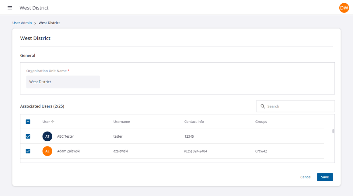 - Enter an Organization Unit Name, and then select any users from the Associated Users section.
