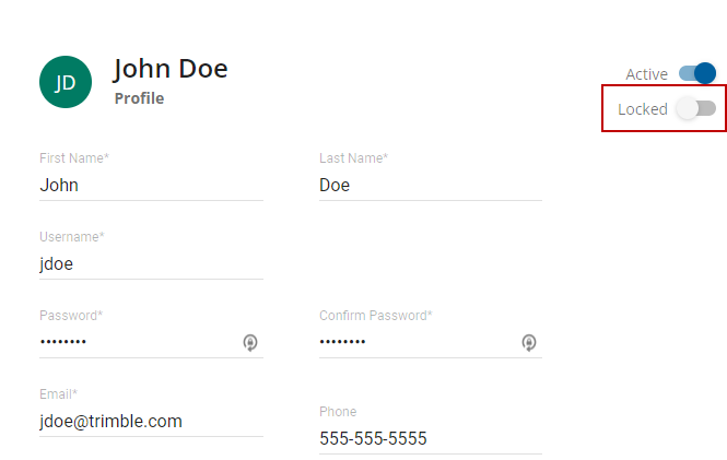 If a user fails to log in successfully, they are locked out. When that happens, an administrator must edit the user and click the Locked toggle switch to unlock the user. The administrator can also update the user's password or deactivate the user by clicking the Active option.