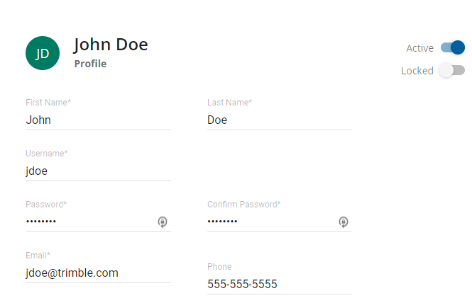 - In the Profile section, enter the new user's first and last name, username, password, email, and phone number. Note that this password is temporary.