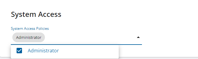 - In the System Access section, select Administrator if this user should be an administrator. A user with the administrator role will have access to all functionality within Trimble Unity, including User Admin and setting up permission policies, notification groups, and system settings.