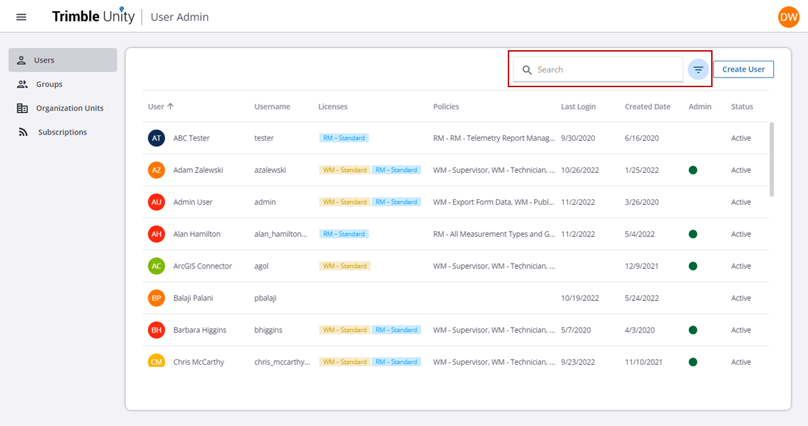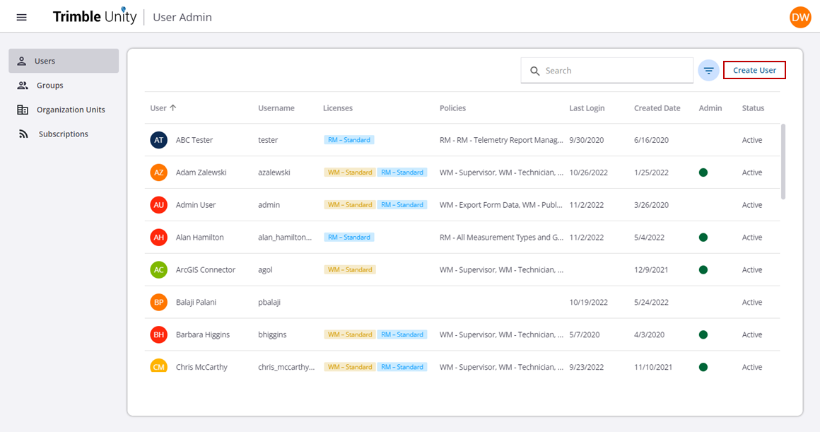 The User Admin page opens. From here you can manage users, groups, and organization units as well as view subscriptions.