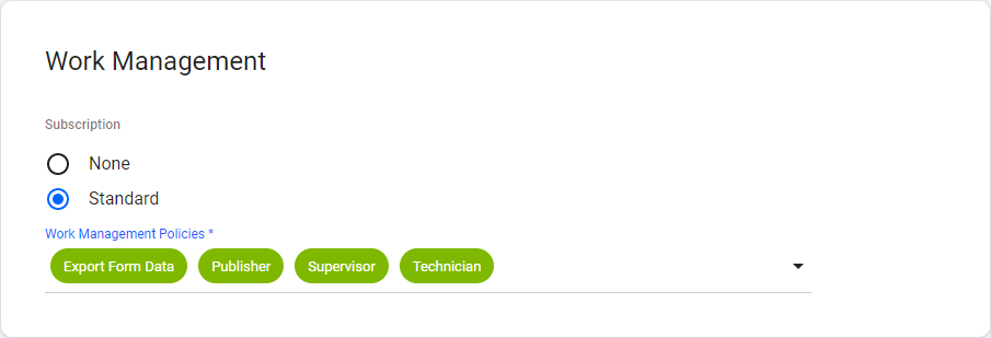 - In the Work Management section, select Standard if this user should have a Work Management subscription. Select the desired permission policies for this user.
