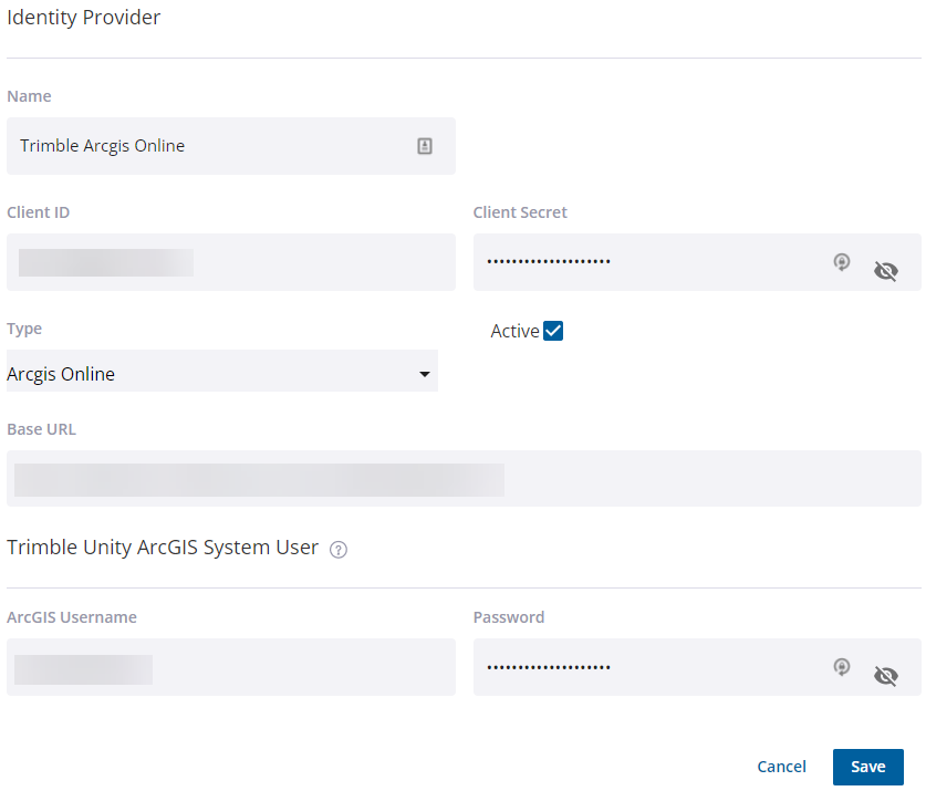 NOTE: The Trimble Unity ArcGIS System User credentials are used by Trimble Unity to generate the mobile cache for offline use by the Trimble Unity mobile app. It is also required if Trimble Unity is configured to update the GIS data with KPIs from the Trimble Unity RM ArcGIS Connector.