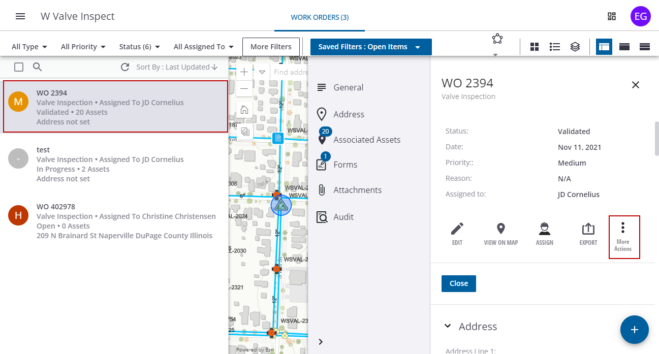 The new work order shows in the work order list. The existing assets are also added to the new work order.