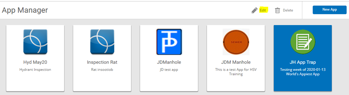 - Select the app you want to associate the ArcGIS dashboard(s) to, and then click Edit. Note that if you don’t see the app on the list, it could be because the Trimble Water professional services team has created this custom app and it is not made available for editing by your organization. Contact the Trimble Water support team if you need assistance in linking dashboards to custom apps.