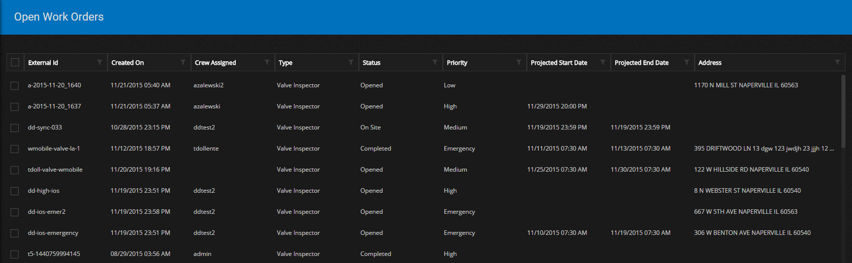 You can dispatch several work orders at once from the Open Work Orders screen and the map (see Batch assigning field crews from the map). This is useful when several jobs need to be dispatched based on priority, projected start date, or other information related to the work orders.